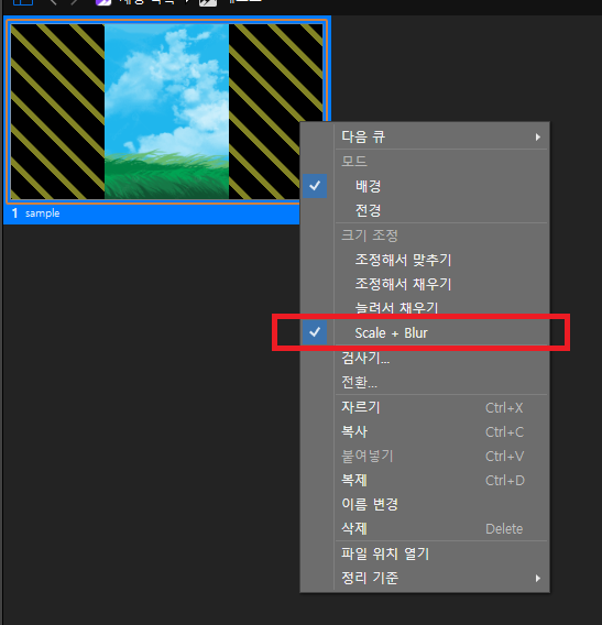 이전에는 없던 Scale + Blur 라는 메뉴가 활성화 되었는데 선택해주시면 위에 이미지처럼 배경의 빈 부분에 빗금이 쳐집니다.