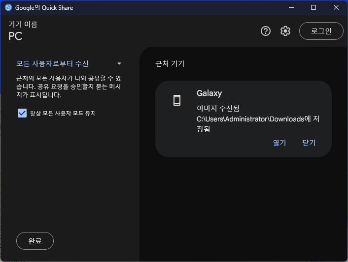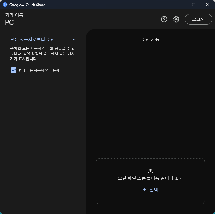 그러고나면 Google의 QuickShare 라는 프로그램이 하나 설치가 되어있는데 실행해보시면 아래와 같은 창이 하나 표시됩니다.