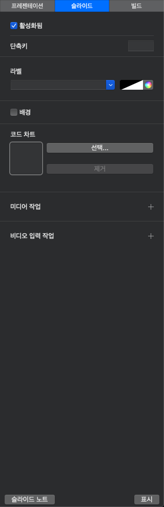 '라벨'은 쇼창에서 보이는 현재 슬라이드 하단의 라벨을 설정할 수 있습니다.