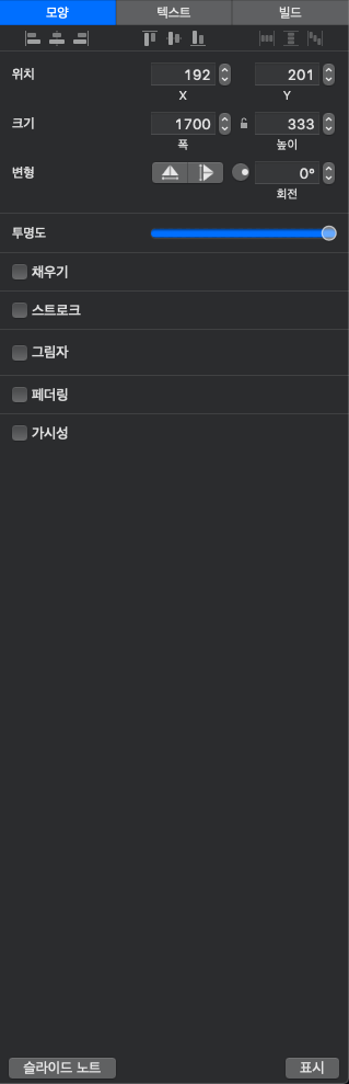 맨 윗줄의 메뉴에서 개체의 '정렬'을 설정할 수 있다.