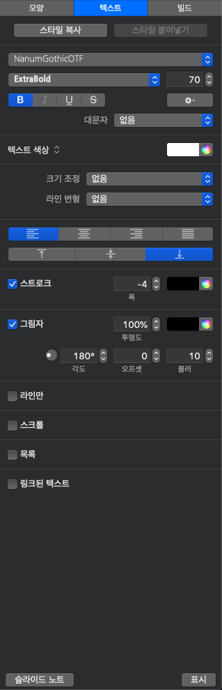 2) 텍스트 - 텍스트 버튼을 사용하면 글꼴, 정렬, 획 및 그림자에 대한 설정을 조정하여 선택한 슬라이드의 텍스트 서식을 지정할 수 있습니다.