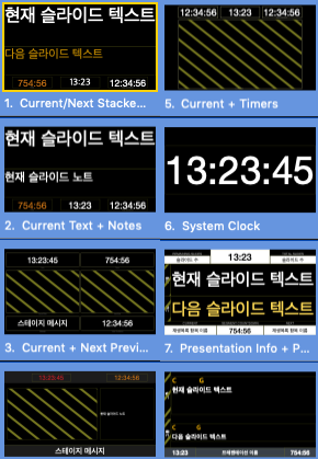 그리고 설교나 강의 등에는 두번째 네번째의 스테이지뷰가 보기 좋을수 있습니다. 프로프리젠터의 경우 각 슬라이드에 슬라이드 노트를 작성해 둘수있는데 슬라이드 노트에 원고를 담아두신다면 보기 좋으시겠죠? (물론 설교/강의자가 직접 넘기시는 경우가 아니라면 원고를 따로 보시는게 더 편하실수있습니다)