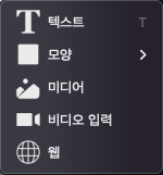 이렇게 몇가지를 선택할 수 있는데 텍스트 / 모양(도형) / 미디어 정도를 사용하고 비디오랑 웹은 거의 안쓰실거예요