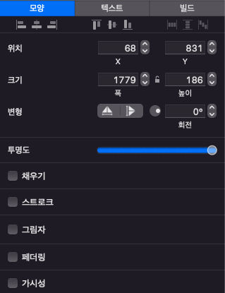 '모양' 항목에서는 텍스트 박스자체에 대해서만 편집 할 수 있고