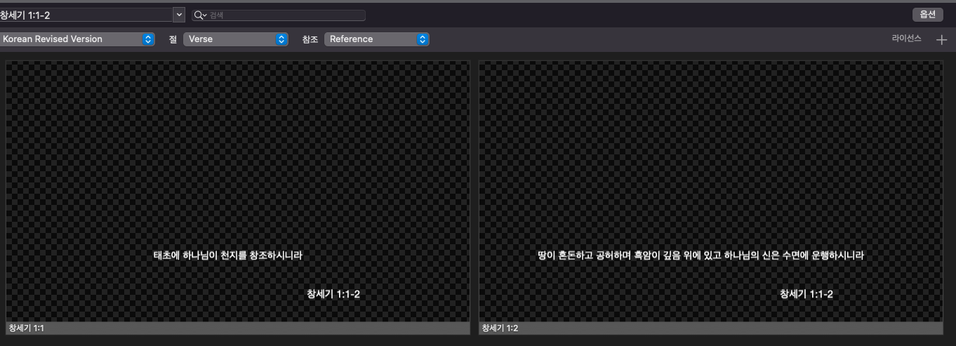 먼저 성경 처음에 있는 슬라이드 하나를 복사해줍니다. 복사해서 편집창을 들어가보면 아래처럼 레퍼런스와 벌스가 있습니다.