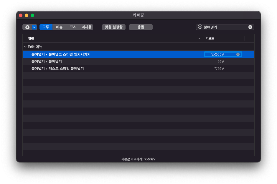 저는 저 단축키를 ⌘(cmd)+⇧(shift)+V로 바꿔서 사용중입니다 (아무래도 4개를 눌러야하는건.. 힘들더라고요)