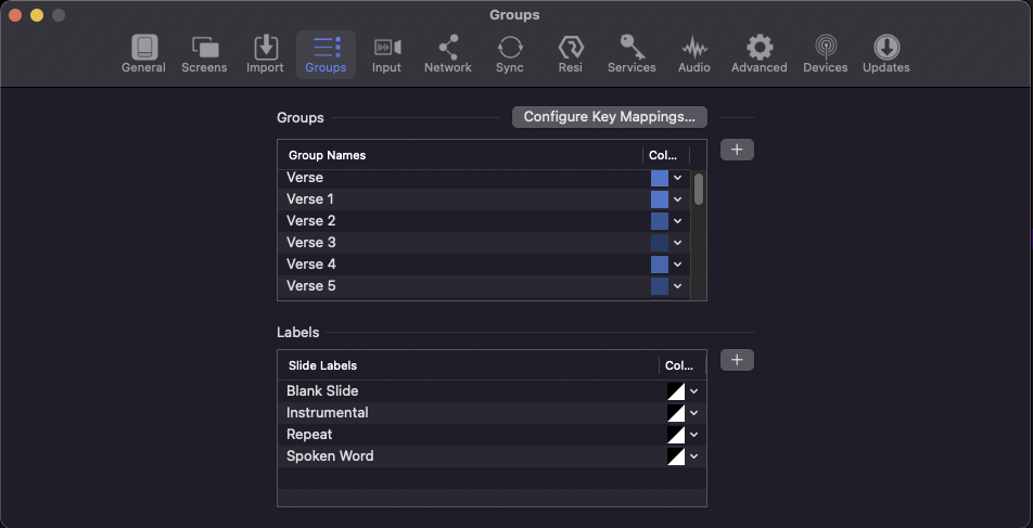 레이블을 사용하여 슬라이드에 짧은 메모를 추가할 수 있습니다. 그룹은 일반적으로 스탠자를 구성하고 노래를 쉽게 정리할 수 있도록 노래에 사용됩니다. 슬라이드에는 레이블과 그룹이 모두 있을 수 있습니다.