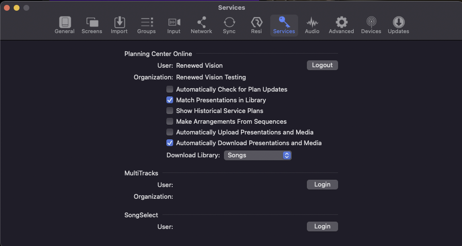 그 아래는 SongSelect 에 로그인 할 수 있는 영역 중 하나입니다 . 로그인 버튼을 클릭하면 SongSelect 계정을 ProPresenter에 연결할 수 있는 대화 상자가 나타납니다. 이미 로그인한 경우 사용자 이름이 표시되고 필요한 경우 로그아웃 버튼이 표시 됩니다. 이 통합을 사용하려면 SongSelect를 사용한 고급 서브션이 필요합니다.