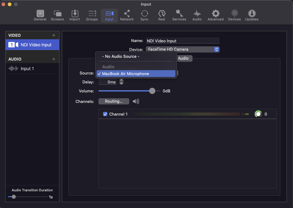 드롭다운 메뉴에서 오디오 입력 소스를 선택할 수 있습니다. 이 드롭다운에는 오디오 전용 인터페이스뿐만 아니라 오디오가 포함된 프로그램으로 들어오는 모든 비디오 입력이 표시됩니다.