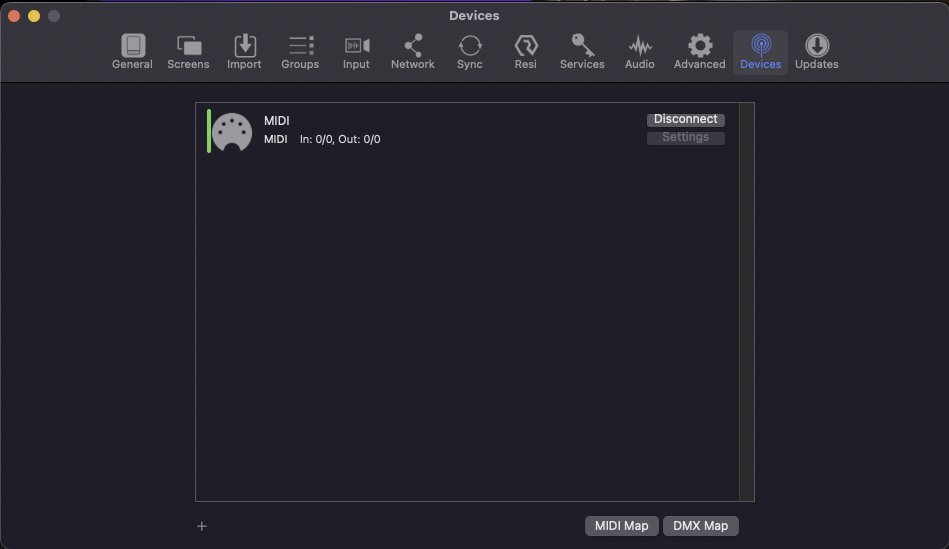 장치 탭에서 사용할 ProPresenter용 통신 장치를 추가할 수 있습니다. Windows 버전은 Midi 통신을 추가하는 기능을 제공합니다. Mac 버전은 Midi, DMX, AMP, CITP, GlobalCache, GVG100, RossTalk, Sony BVS, Sony BVW 및 VDCP의 더 많은 통신 옵션을 제공합니다.