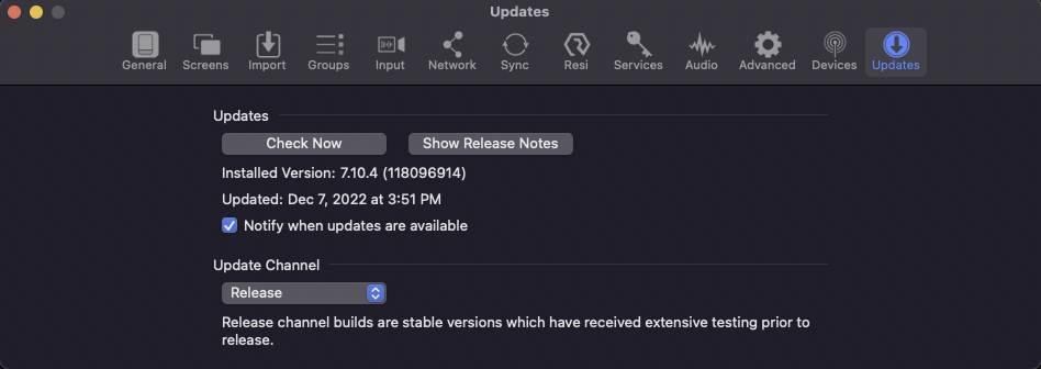 - Resi ProPresenter 인코더의 최신 버전을 확인하십시오. 여기에서 업데이트 를 확인하여 최신 버전인지 확인할 수 있습니다.