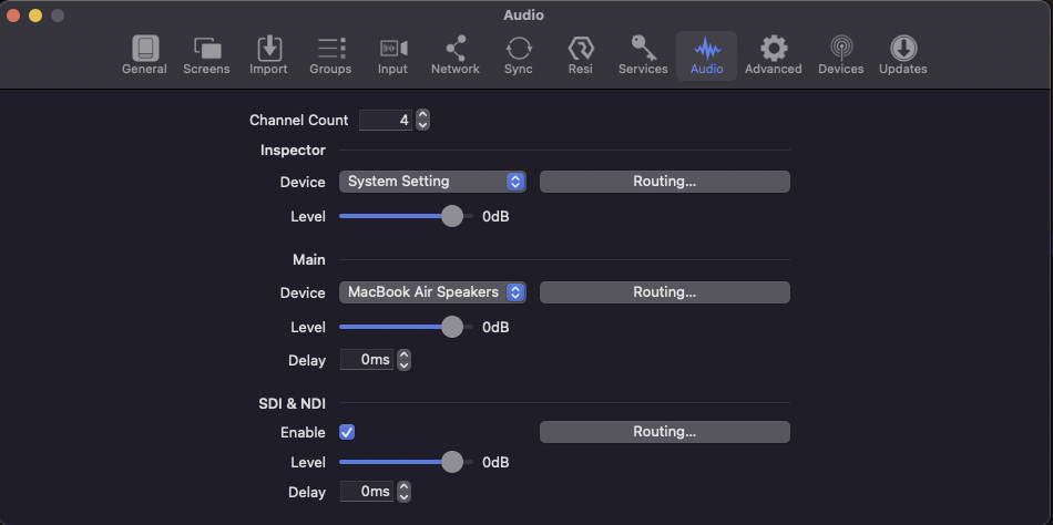 오디오 소스를 선택한 후에는 입력의 마스터 볼륨인 밀리초 단위로 지연을 설정하고 오디오의 개별 채널도 볼 수 있습니다. 고급 신호 흐름을 원하는 경우 오디오 라우팅을 설정하는 옵션도 있습니다. Routing 옆의 스피커를 클릭하면 오디오 입력 사운드를 모니터링할 수 있습니다. 기본 설정의 오디오 탭에서 검사기 출력으로 선택한 오디오 장치를 통해 전송됩니다.