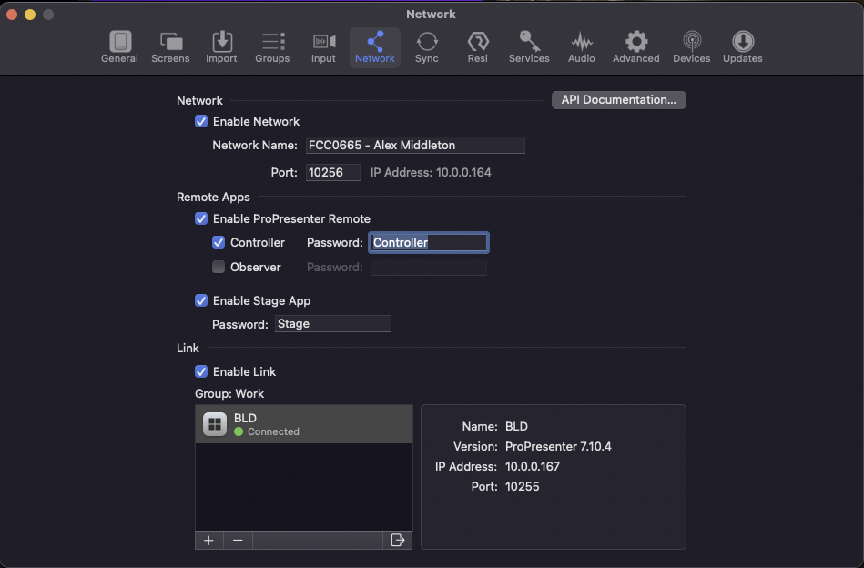 네트워크 서비스를 활성화하려면 네트워크 활성화 확인란을 선택해야 합니다. 네트워크 이름과 포트는 자동으로 설정됩니다. 포트 번호를 변경할 필요가 없을 것입니다. 일반적으로 네트워크 관리 요구 사항으로 인해 특정 포트를 통해 ProPresenter의 네트워크 트래픽을 구체적으로 라우팅해야 하는 경우에만 포트를 변경하면 됩니다. 여기에 컴퓨터 IP 주소도 표시됩니다.