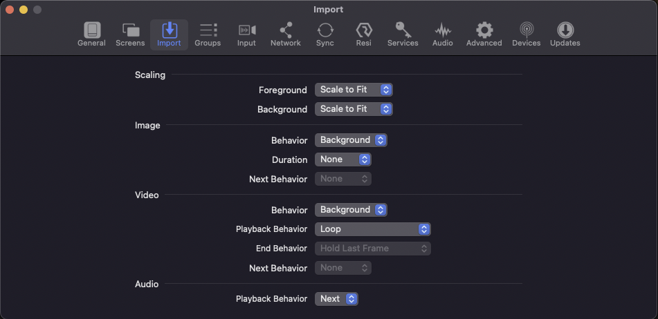크기 조정 아래에서 미디어를 ProPresenter로 가져올 때마다 사용할 크기 조정 동작을 선택합니다. 전경 또는 배경 모두에 대해 선택할 수 있습니다 .