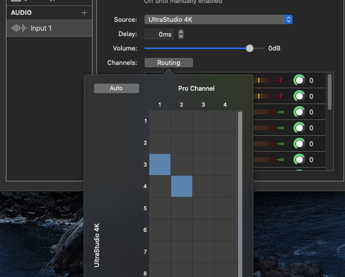 라우팅 창을 열면 왼쪽에 입력 채널이 표시되고 상단에 ProPresenter 오디오 채널이 표시됩니다. 자동을 선택하면 표준 방식으로 채널이 일치합니다(입력 채널 1이 ProPresenter 채널 1로 라우팅되는 식). 이를 사용자 정의하려면 두 선택 항목의 교차점에 있는 셀을 클릭하기만 하면 상자가 켜집니다. 따라서 위의 예에서 입력의 채널 3과 4는 출력의 채널 1과 2로 전송됩니다.