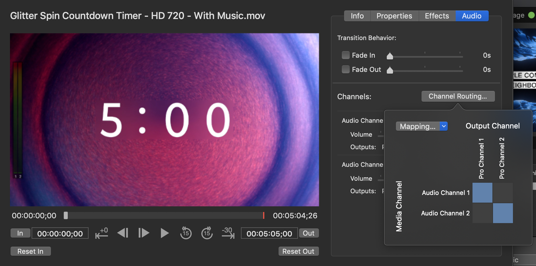 ProPresenter에서 재생되는 미디어는 특정 ProPresenter 채널로 라우팅될 수도 있습니다. 기본적으로 미디어의 오디오 채널은 해당 ProPresenter 채널(1:1, 2:2 등)로 라우팅됩니다. 큐 인스펙터의 오디오 탭에서 특정 미디어 액션에 대한 개별 오디오 라우팅에 액세스할 수 있습니다(미디어 액션을 마우스 오른쪽 버튼으로 클릭하고 "인스펙터"를 선택한 다음 인스펙터 창 오른쪽에 있는 오디오 탭 선택). 인스펙터에서 보고 있는 미디어 액션에 오디오가 내장되어 있는 경우에만 오디오 탭에 액세스할 수 있습니다.