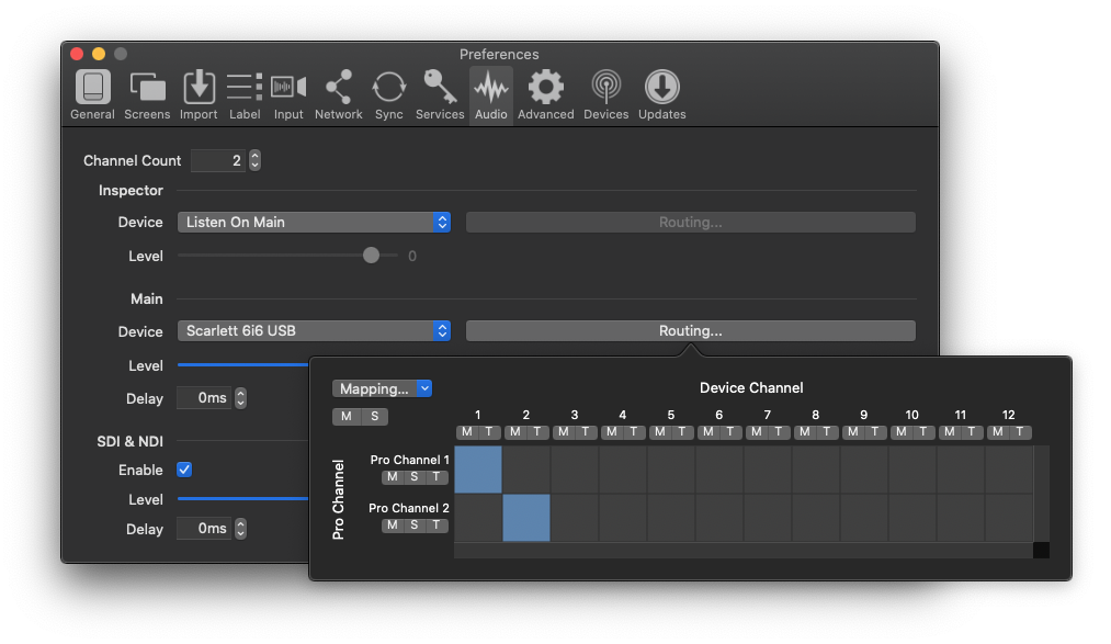 오디오 입력 라우팅 옵션을 사용하면 USB 오디오 인터페이스와 같은 장치를 사용하고 장치의 채널을 내부 ProPresenter 채널로 라우팅하는 방법을 선택할 수 있습니다.