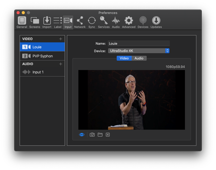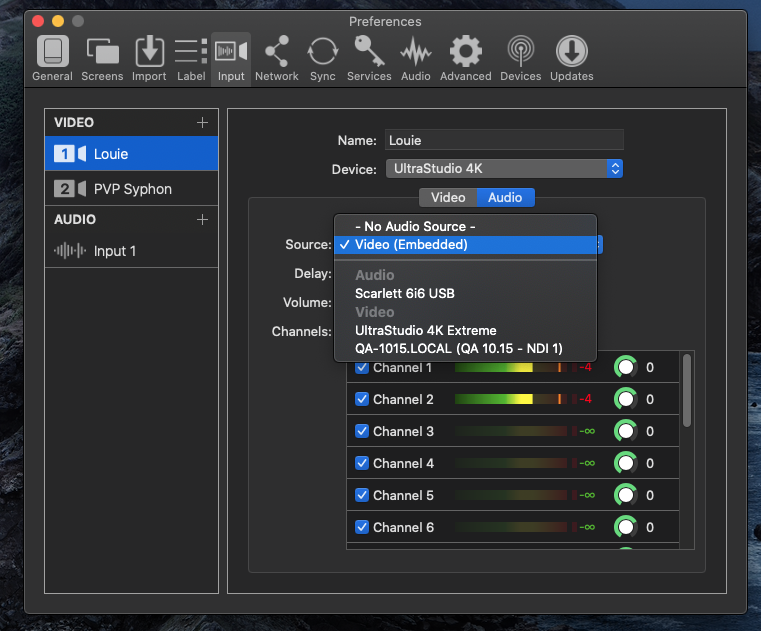모든 오디오 입력 소스를 각 비디오 입력에 연결할 수 있습니다. 비디오 입력에 오디오(예: SDI 장치)가 포함된 경우 ProPresenter는 기본적으로 이 오디오 소스를 선택합니다. 추가 오디오 입력을 설정하는 방법을 알아보려면 여기에서 기술 자료 문서를 참조하십시오 .