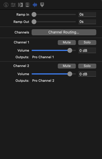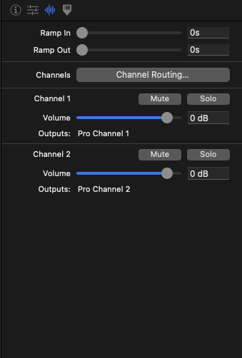 오디오 탭 하단의 채널 정보는 각 오디오 채널에 대한 자세한 정보를 제공합니다. 각 채널 에 대해 채널을 음소거 또는 솔로 할 수 있으며 각 특정 채널 의 볼륨 을 조정할 수 있습니다 . 이 영역은 또한 각 채널이 할당된 출력을 알려줍니다(위의 오디오 라우팅 버튼을 통해 설정됨).