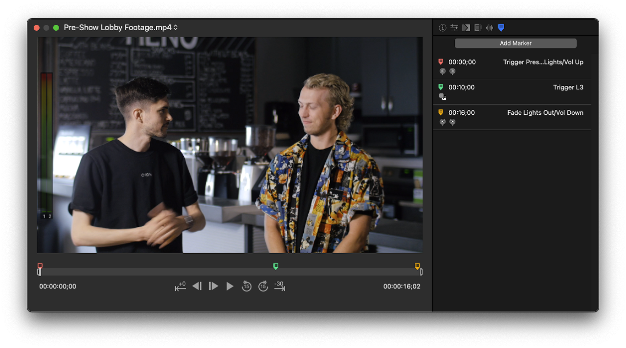 비디오 또는 오디오 항목이 트리거되면 구성된 재생 마커가 전송 제어에서 해당 색상의 더 작은 마커 아이콘으로 표시될 수 있습니다. Transport Controls 스크럽 막대의 양쪽 끝에 있는 경과 시간 및 카운트다운 종료 시간을 토글하여 각각 이전 마커에서 시간 및 다음 마커까지의 시간을 표시할 수 있습니다. 켜면 시간도 이전/다음 마커의 색상으로 변경됩니다. 비디오 및 오디오에 대한 전송 컨트롤에 표시되는 새로운 마커 아이콘이 있습니다. 이 아이콘을 클릭하면 각각의 색상 아이콘, 시간 코드 및 이름(해당되는 경우)과 함께 구성된 마커가 표시됩니다. 마커 중 하나를 클릭하면 재생 헤드가 자동으로 선택한 마커의 타임코드로 이동하고 마커에 할당된 작업을 수행합니다(해당하는 경우).