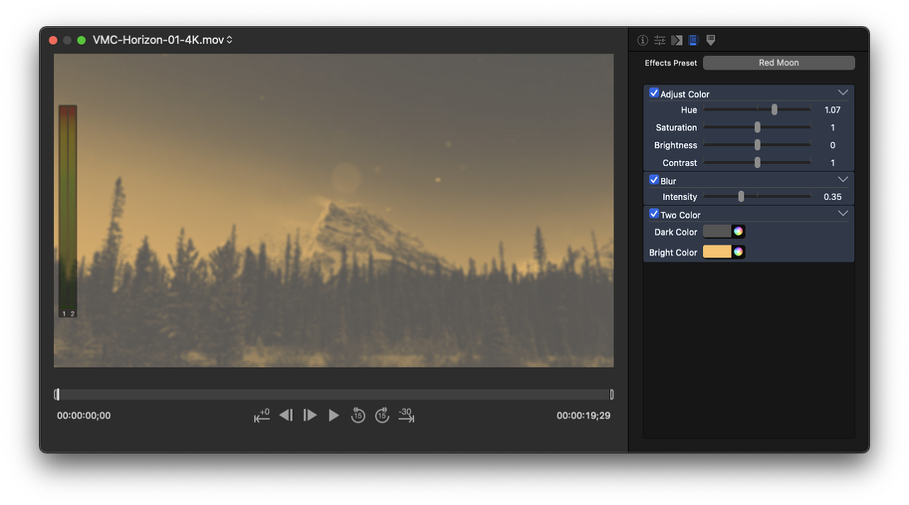 효과를 사용하면 미디어 파일의 모양을 수정할 수 있습니다. 더하기 버튼을 클릭하여 미디어에 효과를 추가합니다. 해당 효과 아래의 옵션을 조정하여 효과의 속성을 조정합니다(모든 효과에 편집할 수 있는 속성이 있는 것은 아님). 효과를 비활성화/활성화하려면 효과 이름 왼쪽에 있는 확인란을 클릭하십시오. 효과를 다른 효과로 변경하거나 효과를 제거하려면 효과 이름 오른쪽에 있는 아래쪽 화살표를 클릭하십시오.
