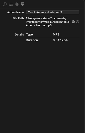 정보 탭 에는 선택한 미디어에 대한 정보가 있습니다 . 상단에는 작업 이름 (클릭하여 편집할 수 있음)과 ProPresenter가 이 파일을 참조 하는 파일 경로 가 나열됩니다. 돋보기 클릭 Mac의 Finder 또는 PC의 Windows 탐색기에서 파일 위치를 엽니다. ProPresenter가 연결되어 있는 파일을 변경하거나 프로그램이 동일한 파일의 다른 사본을 가리키도록 하려면  아이콘 을 클릭하십시오.참조할 새 파일을 선택할 수 있는 컴퓨터 브라우저 창을 엽니다.