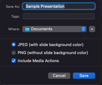 이 옵션은 프레젠테이션의 모든 슬라이드를 JPEG 또는 PNG 이미지로 내보냅니다. JPEG 이미지에는 선택한 슬라이드 배경색이 포함되지만 PNG에는 슬라이드 배경색이 포함되지 않습니다.