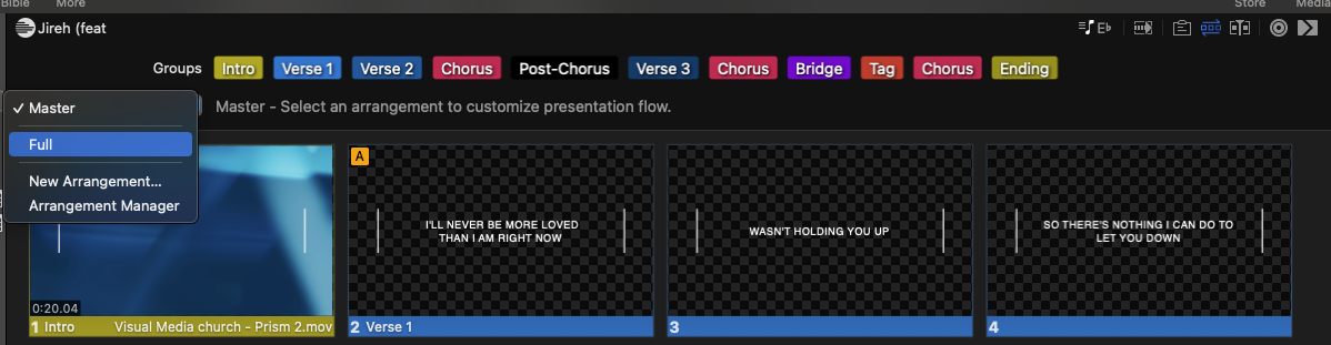 ProPresenter의 모든 프레젠테이션은 단일 미디어 작업인 경우에도 하나 이상의 슬라이드로 구성됩니다.각 슬라이드는 미디어 작업의 유형, 슬라이드를 클릭할 때 발생할 다른 작업이 있는지 여부를 포함하여 슬라이드를 클릭할 때 일어날 일에 대해 많은 것을 알려줄 수 있습니다. 그룹 또는 레이블 등이 있습니다.
