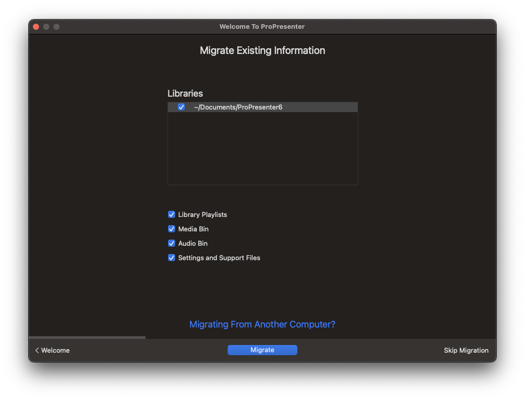 지금 마이그레이션을 원하지 않거나 마이그레이션할 이전 데이터가 없는 경우 마이그레이션 건너뛰기를 선택할 수 있습니다. 나중에 언제든지 파일>가져오기>ProPresenter 라이브러리로 이동하여 기존 데이터를 마이그레이션하도록 선택할 수 있습니다.