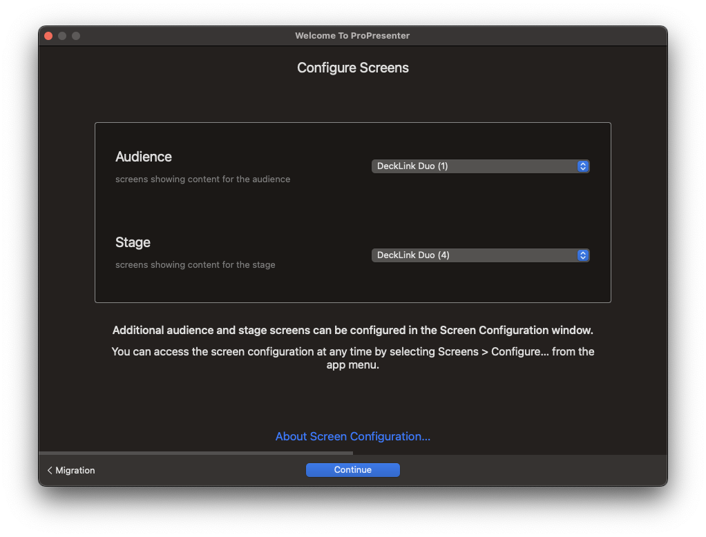 마이그레이션이 완료되거나 건너뛰면 다음 창에서 단일 Audience 화면과 Stage 화면을 설정할 수 있습니다. 화면 설정에 대한 자세한 내용은 여기 의 사용 설명서에서 나중에 확인할 수 있습니다 .