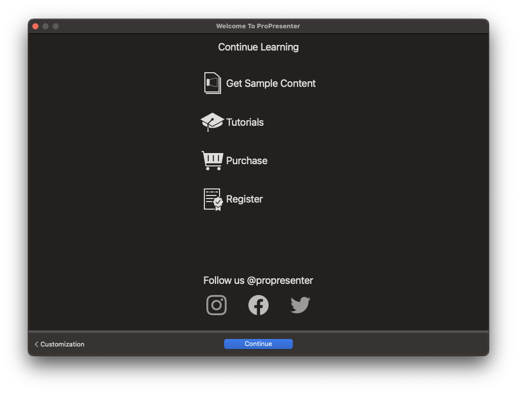 이 창에서 "계속"을 클릭하면 빠른 시작 마법사가 닫히고 ProPresenter 경험을 시작할 준비가 됩니다. 이 작업을 다시 수행하고 싶은 경우 또는 프로그램을 시작할 때 처음에 건너뛴 경우 상단 도구 모음에서 창을 선택한 다음 "Welcome to ProPresenter"를 선택하여 언제든지 이 안내서에 다시 액세스할 수 있습니다.