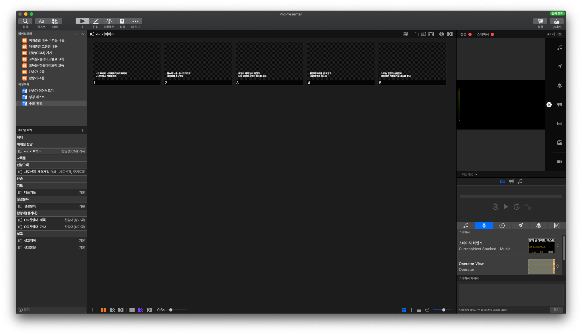 5) 편집은 슬라이드 콘텐츠를 만들고 편집할 수 있는 표준 ProPresenter Editor 영역입니다.