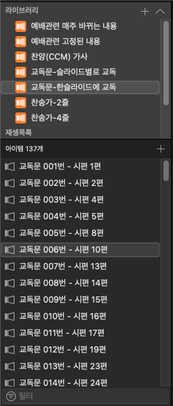 하단의 상세보기는 선택된 재생목록의 아이템들을 나열합니다.