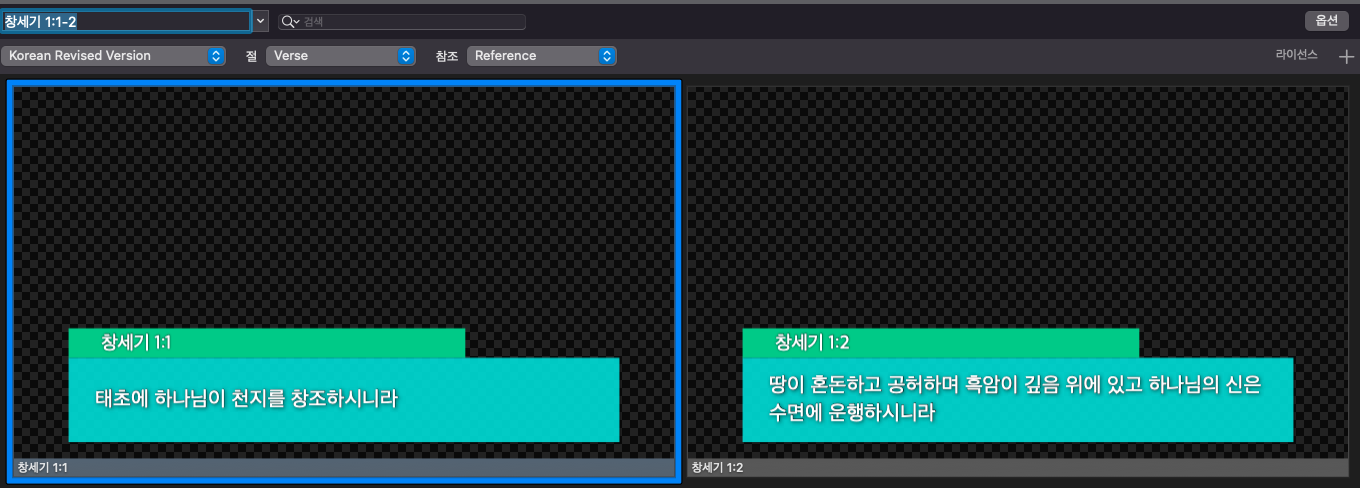 먼저 성경 처음에 있는 슬라이드 하나를 복사해줍니다. 복사해서 편집창을 들어가보면 아래처럼 레퍼런스와 벌스가 있습니다.