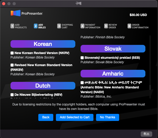NKRV는 개역개정 / RNKSV는 새번역이니 원하는 성경에 체크 하시고 밑에 add selected to cart를 눌러주시면 됩니다