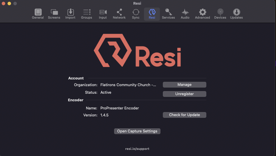 - Resi 계정의 상태와 사용 중인 ProPresenter 기기의 인코더 이름을 봅니다.