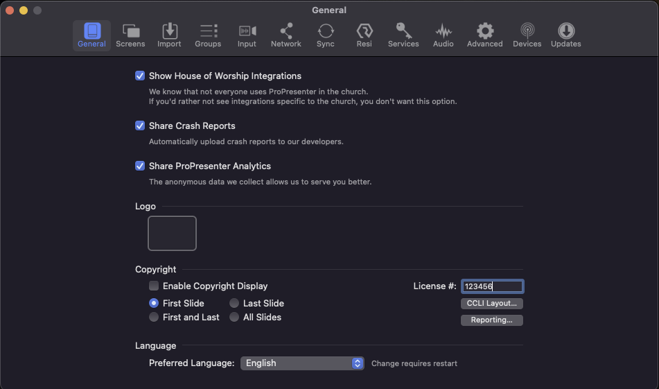기본 설정의 일반 탭에는 프로그램의 다양한 일반 설정, 로고 및 저작권 설정(House of Worship Integrations가 활성화된 경우)이 있습니다.