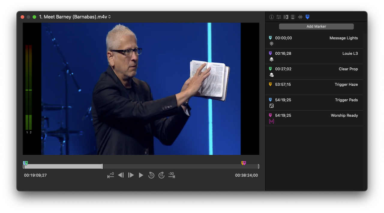 ProPresenter7.10부터 인스펙터의 미디어 파일에 재생 마커를 추가할 수 있습니다. 이 기능을 통해 사용자는 미디어의 특정 지점에 레이블을 지정하고, 특정 지점으로 이동하고, 특정 지점에서 작업을 트리거하고, 특정 마커에서 남은 시간 또는 경과된 시간을 추적할 수 있습니다.
