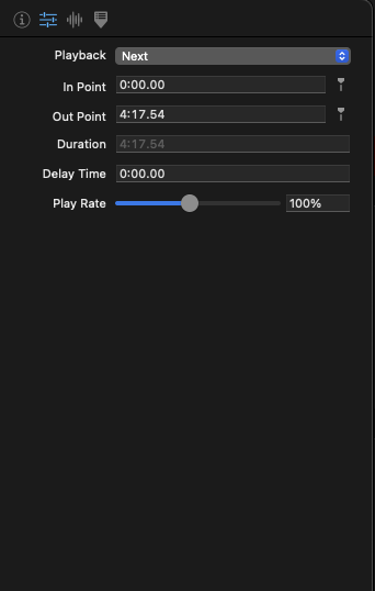 Media Cue 검사기는 미디어 파일을 라이브로 재생하기 전에 미리 보고 이러한 항목의 속성을 편집할 수 있는 심층 창입니다. 이러한 속성에는 ProPresenter에서 트리거될 때 동작이 어떻게 보이고 재생되고 작동하는지가 포함됩니다.