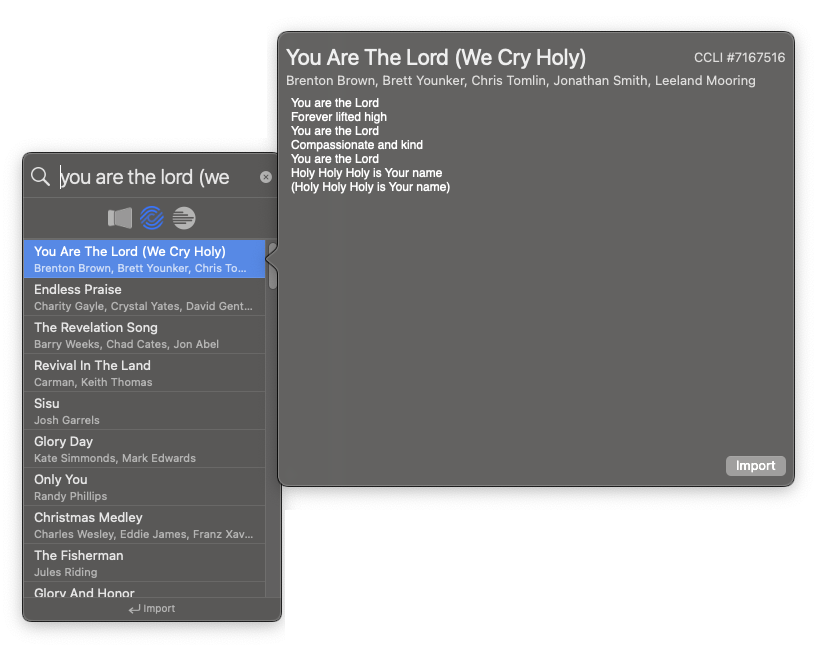 ProPresenter를 사용하면 QuickSearch 창의 SongSelect에서 노래를 검색할 수 있습니다. 이렇게 하려면 도구 모음에서 검색을 클릭하거나 파일>가져오기>노래 선택...으로 이동하여 이 창에 액세스합니다. 여기에서 제목, 저자, 키워드 또는 CCLI 번호로 검색할 수 있습니다.