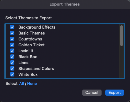 ProPresenter를 사용하면 다른 컴퓨터에서 사용할 테마를 쉽게 내보낼 수 있습니다. 이러한 파일을 찾기 위해 컴퓨터 폴더를 검색하고 수동으로 다른 컴퓨터에 추가하는 대신 특정 테마를 단일 번들 파일로 내보낼 수 있습니다.