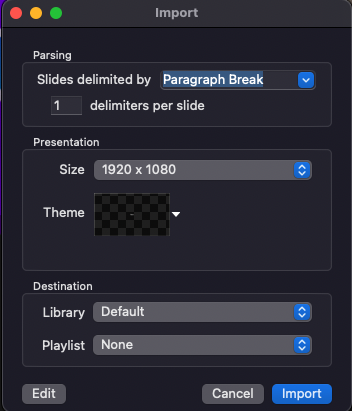 로 구분된 슬라이드 를 사용하면 슬라이드당 줄 또는 단락 수를 지정하거나 소스 파일에서 사용자 정의 슬라이드 나누기 마커를 사용할 수 있습니다. 사용하는 구분 기호에 관계없이 슬라이드당 구분 기호 상자 에 있는 숫자에 따라 새 슬라이드가 생성되는 시기가 결정됩니다. "줄 바꿈"을 선택하고 "2"를 입력하면 스탠자 나누기와 관련하여 각 슬라이드에 두 줄이 표시됩니다. 단락과 동일합니다. 파일에서 "//" 또는 "*"와 같은 고객 구분 기호를 사용한 경우 "다음으로 구분된 슬라이드" 필드에 입력하십시오.