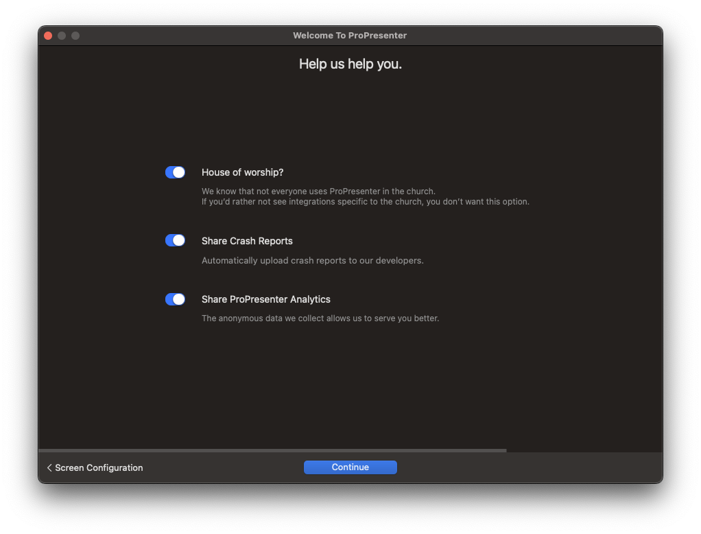 - ProPresenter Analytics 공유 -- 귀하의 경험을 지속적으로 개선하고 강화함에 따라 가장 많은 사용자가 프로그램의 어떤 부분을 사용하고 있는지 알고 싶습니다. 이 옵션을 활성화하면 소프트웨어에서 귀하가 가장 많이 사용하는 기능에 대한 데이터를 보낼 수 있고 함께 미래를 위한 최선의 계획을 세울 수 있습니다.