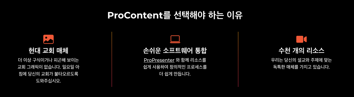 ProContent는 ProPresenter 및 PVP에서 미디어를 그 어느 때보다 쉽게 찾고 사용할 수 있도록 설계된 최고의 구독 기반 미디어 라이브러리입니다. 50,000개 이상의 자산을 사용할 수 있는 ProContent는 예배 영상, 설교 시리즈 및 소셜 미디어 템플릿에 적합합니다. 우리 팀은 화면을 다음 단계로 끌어올리는 데 도움이 될 수 있는 독점적인 새 콘텐츠를 계속 성장하는 이 라이브러리에 지속적으로 추가하고 있습니다.